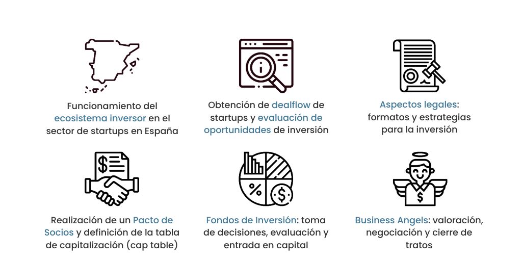 Business Angels, fundadores de Fondos de Venture Capital y abogados especializados compartirán todo su conocimiento sobre la inversión en startups para que los alumnos puedan realizar inversiones más inteligentes desde el primer día.